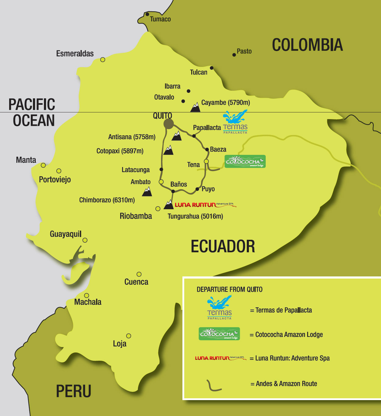 - Lodging in twin/double rooms with private facilities in Termas de Papallacta, Cotococha Amazon Lodge and Luna Runtun